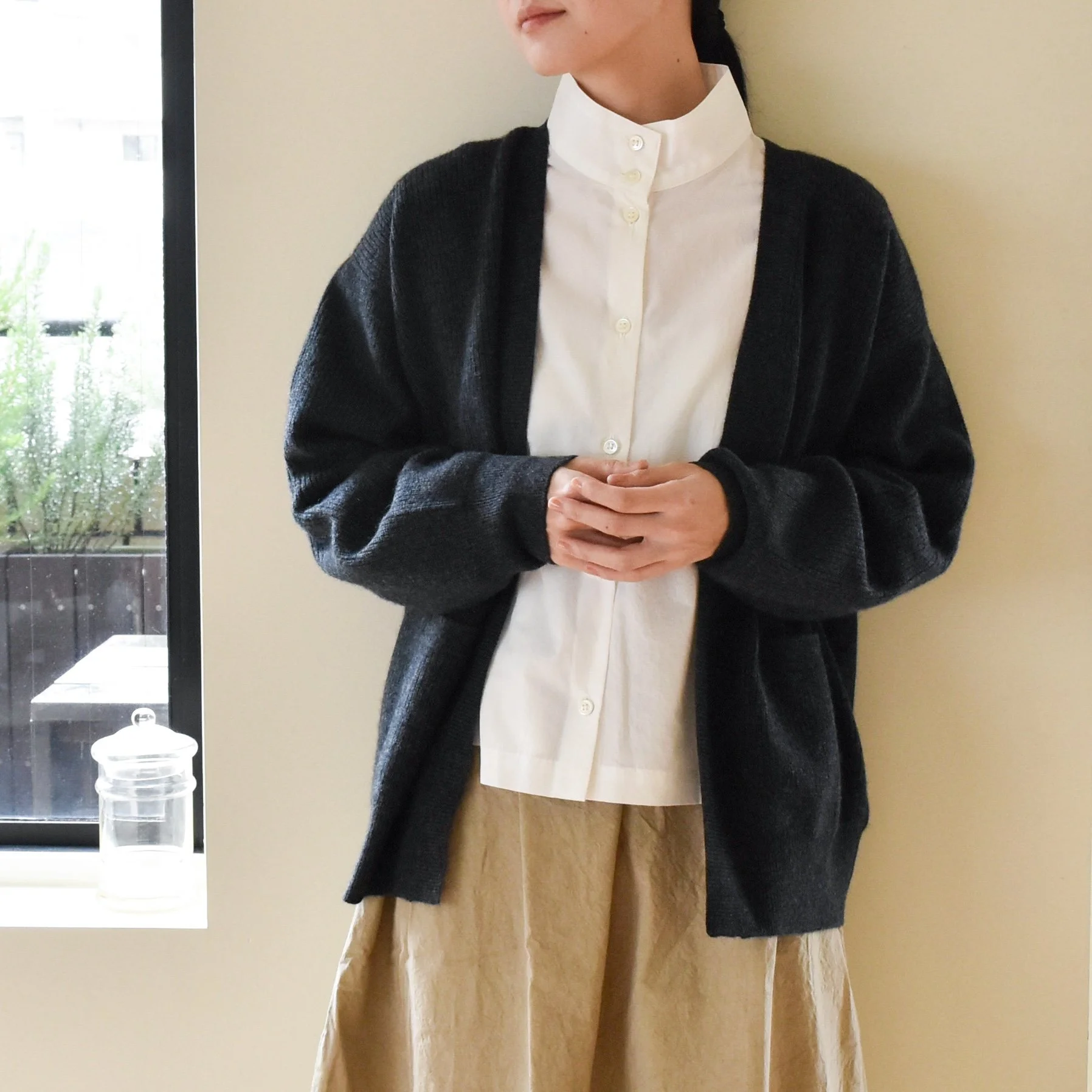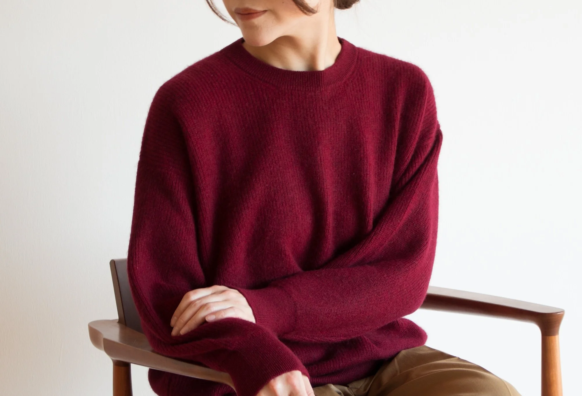モンゴルカシミヤでつくるクルーネックセーターとボタンレスカーディガンを展開します。シーズンで使い捨てるのではなく、年代問わず着られて、毎年ワードローブから出してきても違和感がないデザインを追求しています。